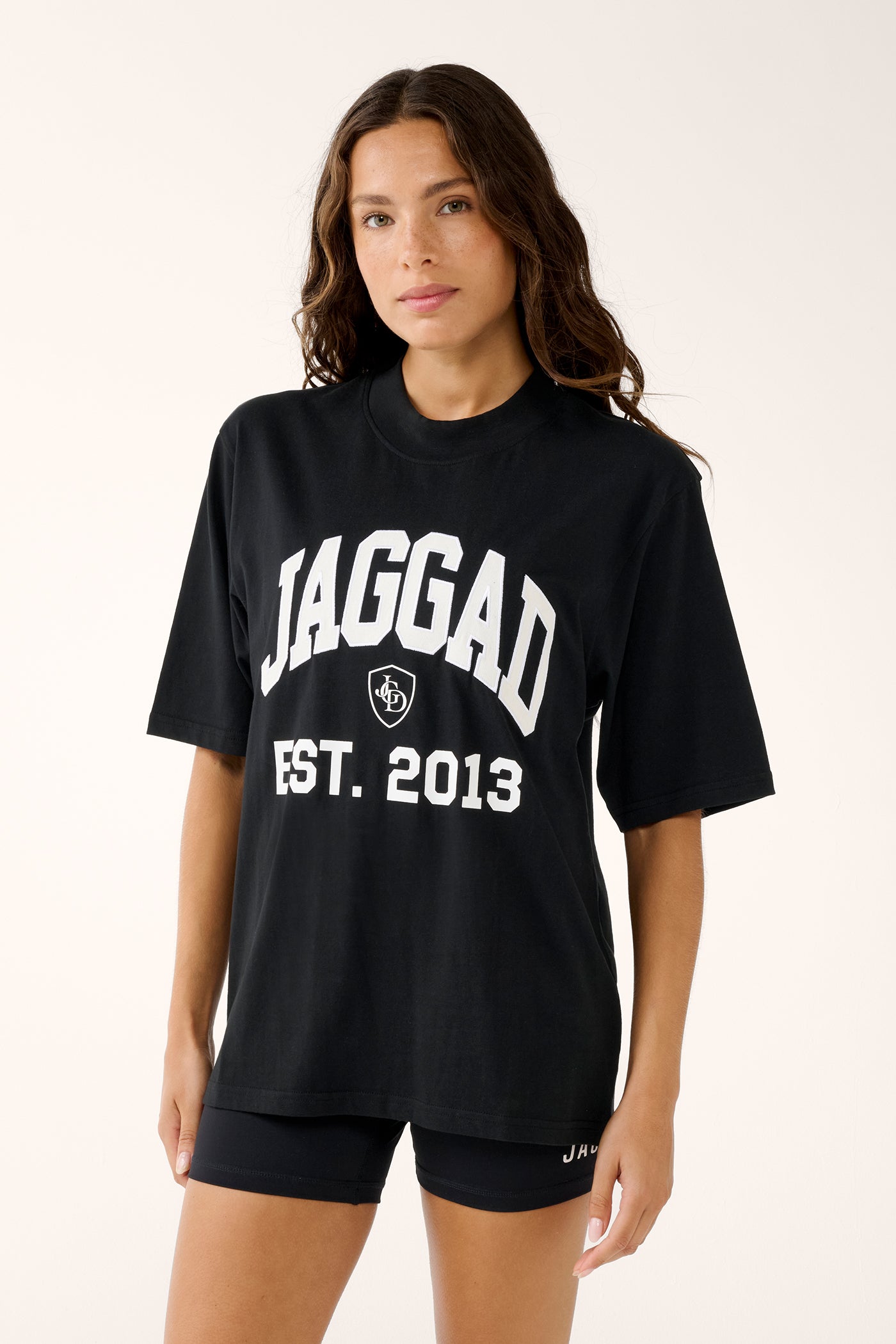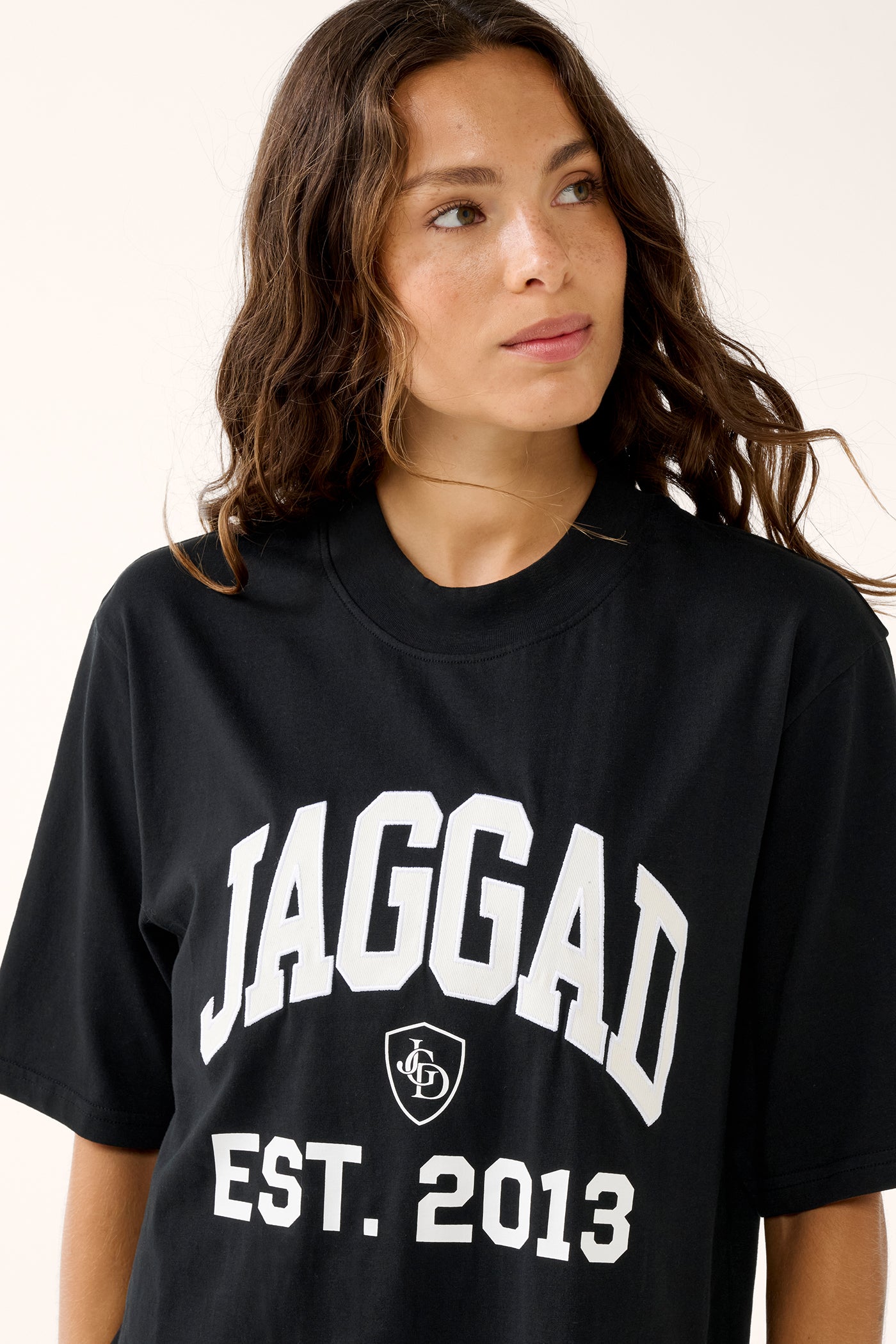 Finished with appliqué and flat embroidery logos in striking white against a black base, it delivers strong monochrome energy with a polished edge. An easy statement tee you’ll reach for on repeat.