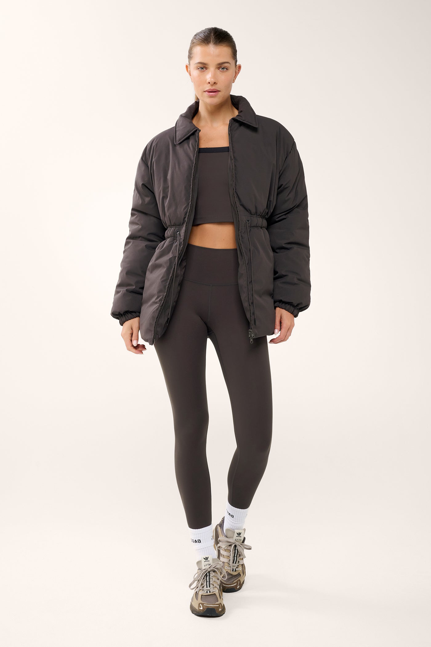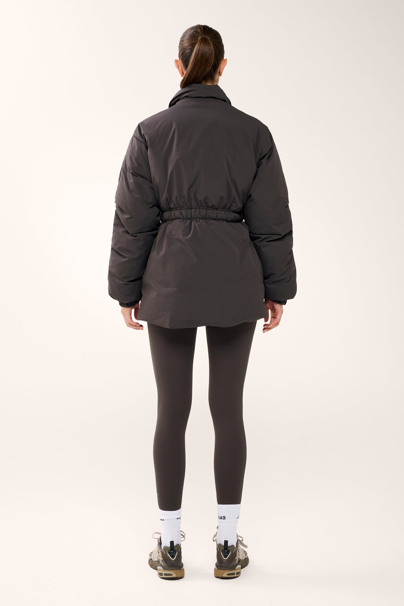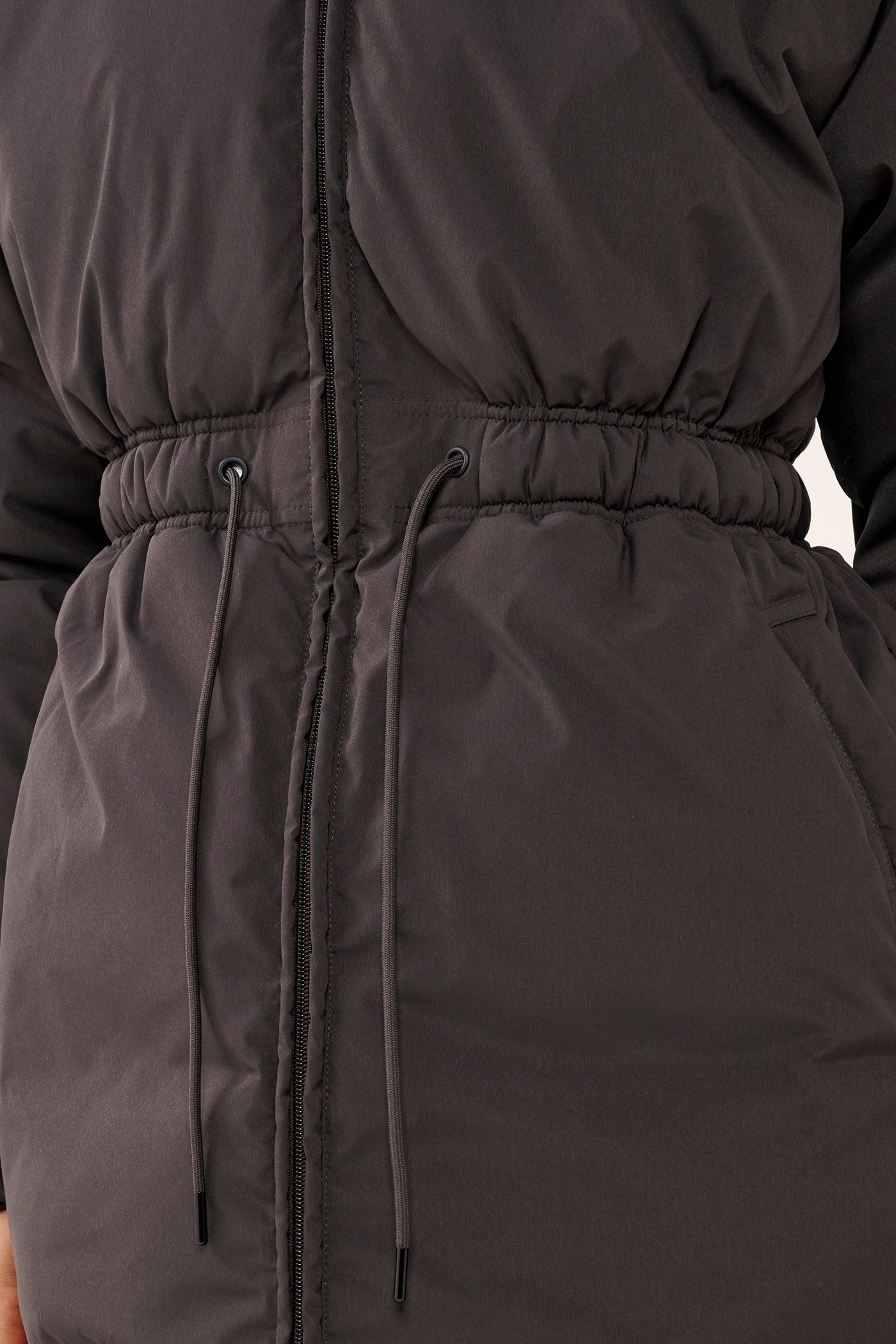 The longer length adds coverage and polish, while the elasticated waist gives subtle shape without sacrificing comfort. Finished with a clean collar and minimal branding, this is the puffer you wear when you want warmth and a put-together feel. Khaki and coffee make it endlessly wearable.