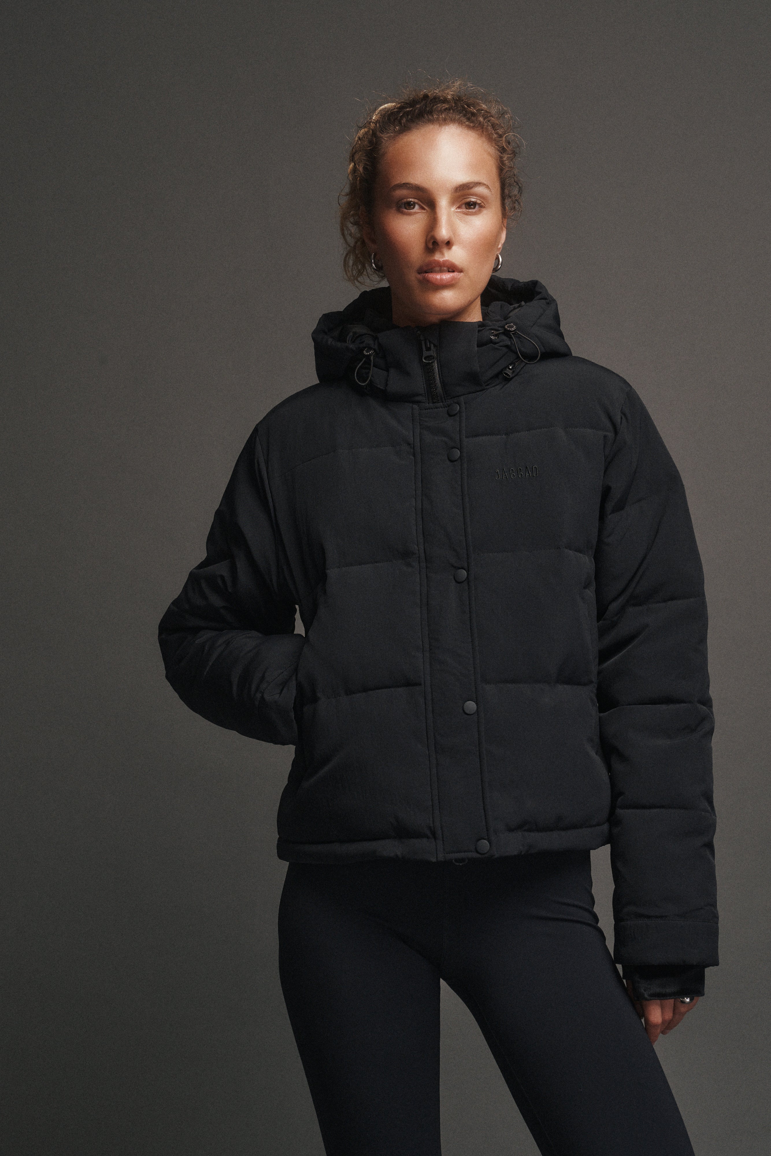 Designed in an easy hip-length silhouette with a zip-through front, zip pockets, and an adjustable drawcord hem so you can wear it relaxed or cinched in. Finished with a clean flat embroidered logo, this black puffer is the throw-on layer you’ll reach for all winter long.