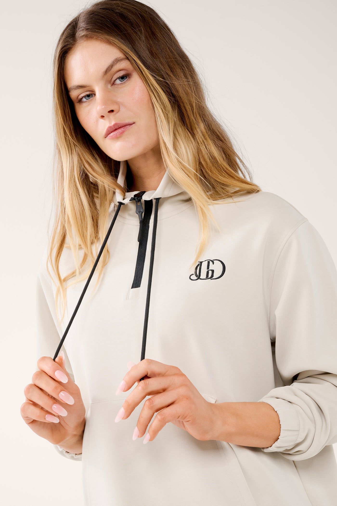 Athletic edge meets throwback polish. With a peached scuba knit, this half-zip sweater is designed to move with you. The longline cut, scalloped hem and kangaroo pocket give it laid-back energy, while the high neck and drawstring add a sporty twist.