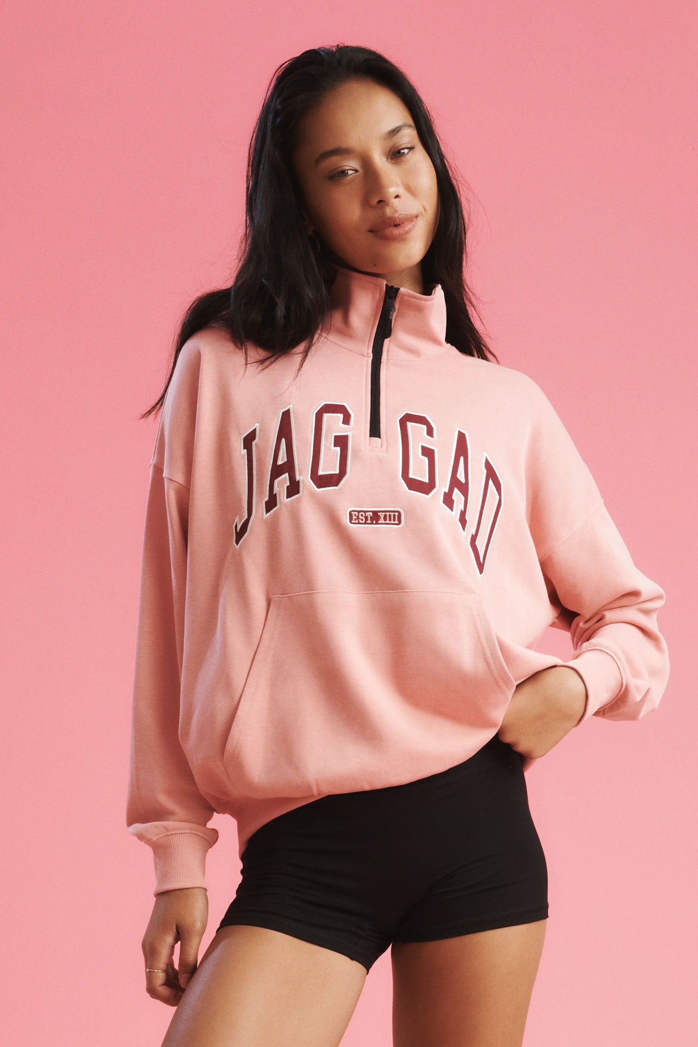 Sporty, oversized and made for everyday comfort. The Love Club Studio Half-Zip Sweater comes in a soft blush tone that feels fresh, feminine and easy to style with your everyday rotation. Crafted from loopback terry with a relaxed drape, it’s your throw-on essential for mornings, errands and everything in between.